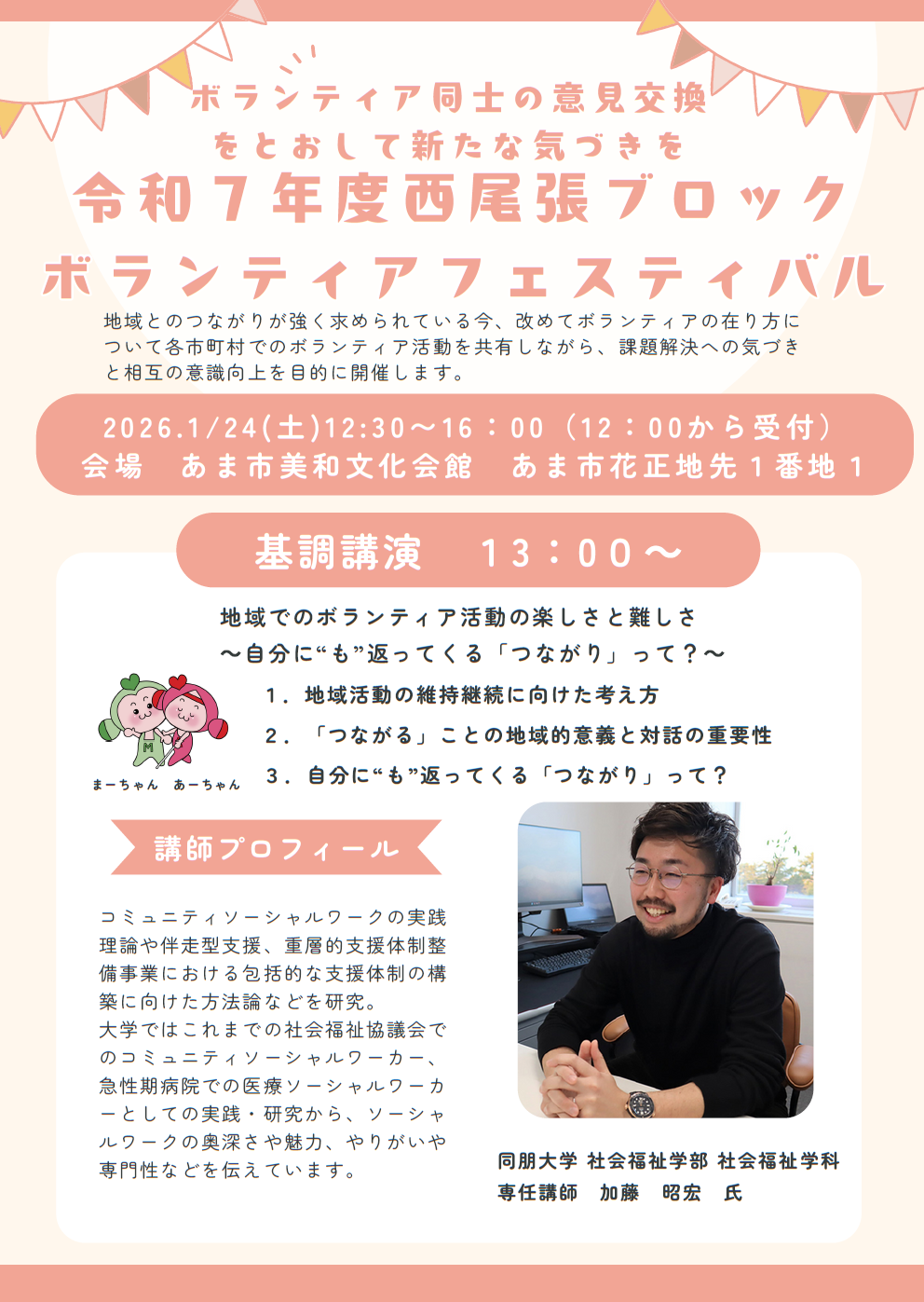 2026年1月24日(土) 、あま市にて行われた「西尾張ブロック ボランティアフェスティバル」にて、本学 社会福祉専攻の加藤昭宏 専任講師が講演を務めました。